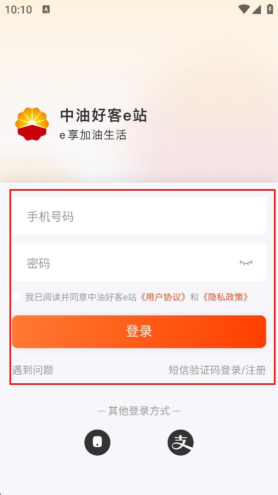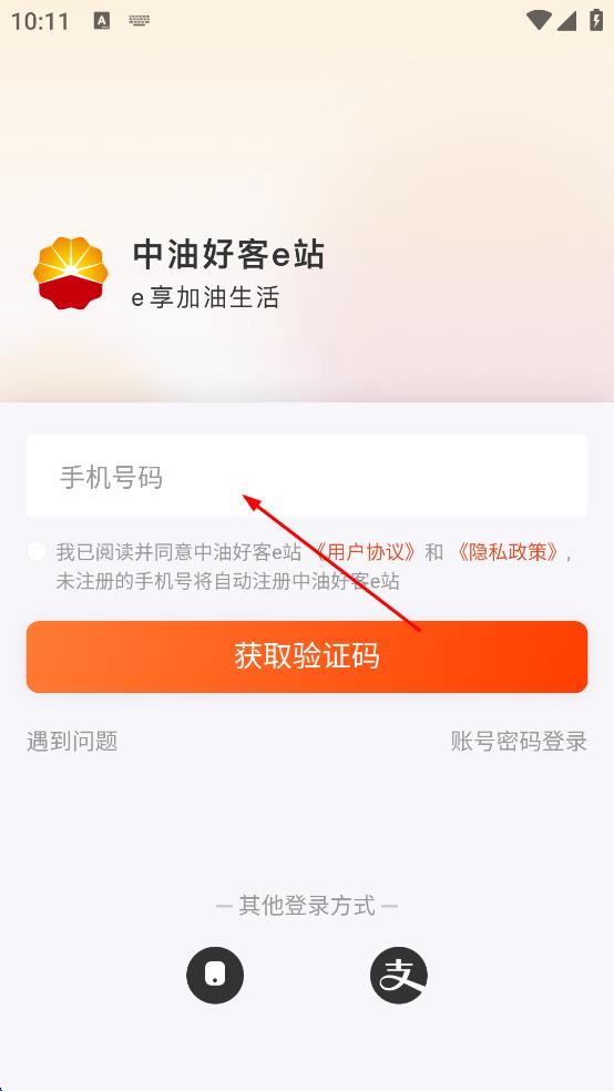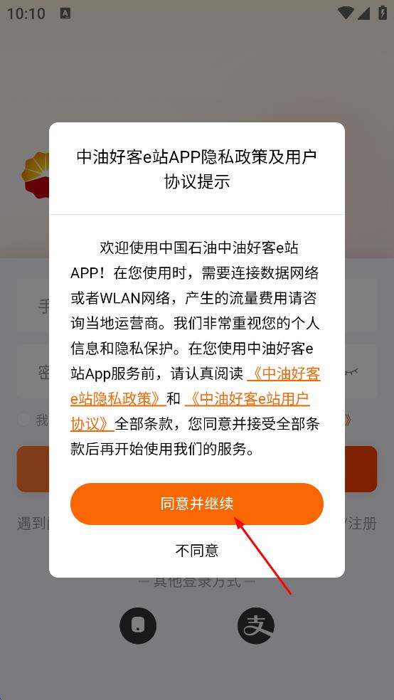 1、打開中油好客e站APP,在彈出的隱私政策及用戶協(xié)議提示框中,認(rèn)真閱讀相關(guān)內(nèi)容后,點(diǎn)擊“同意并繼續(xù)”,進(jìn)入登錄界面。