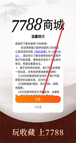 1、點(diǎn)擊“溫馨提示”彈窗的“同意”,進(jìn)入7788商城主界面。