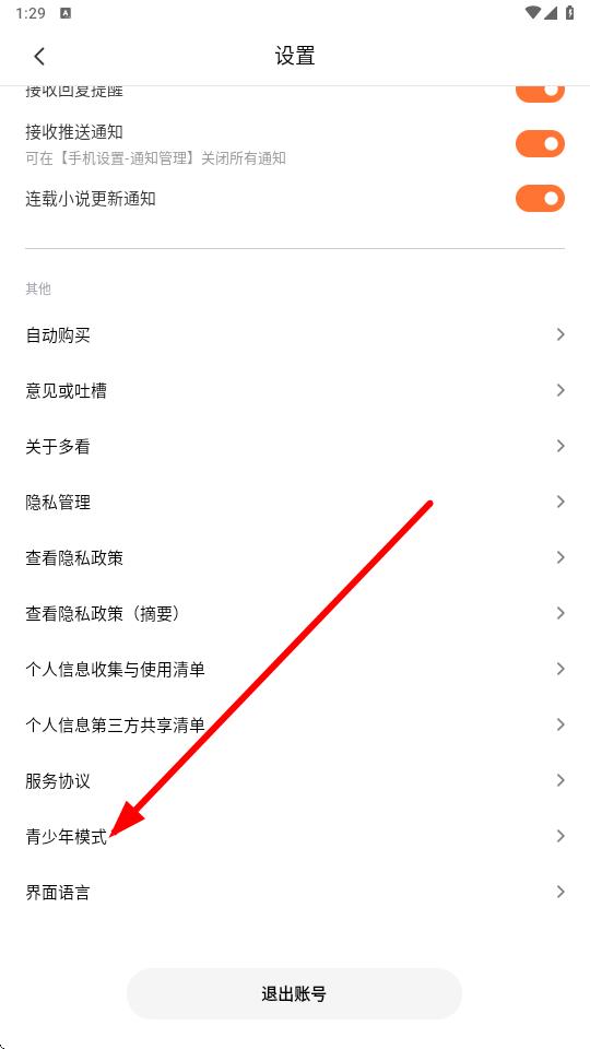 1、打開(kāi)多看閱讀App進(jìn)入設(shè)置頁(yè)面,在設(shè)置選項(xiàng)中找到并點(diǎn)擊青少年模式。