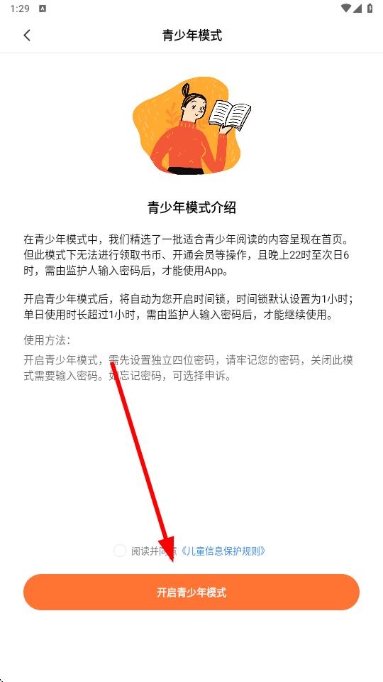 2、進(jìn)入青少年模式介紹界面,閱讀相關(guān)介紹后,勾選同意兒童信息保護(hù)規(guī)則,再點(diǎn)擊開(kāi)啟青少年模式按鈕。