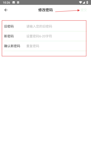 4、在修改密碼界面,依次輸入舊密碼、新密碼、確認(rèn)新密碼,輸入完成后點(diǎn)擊提交。