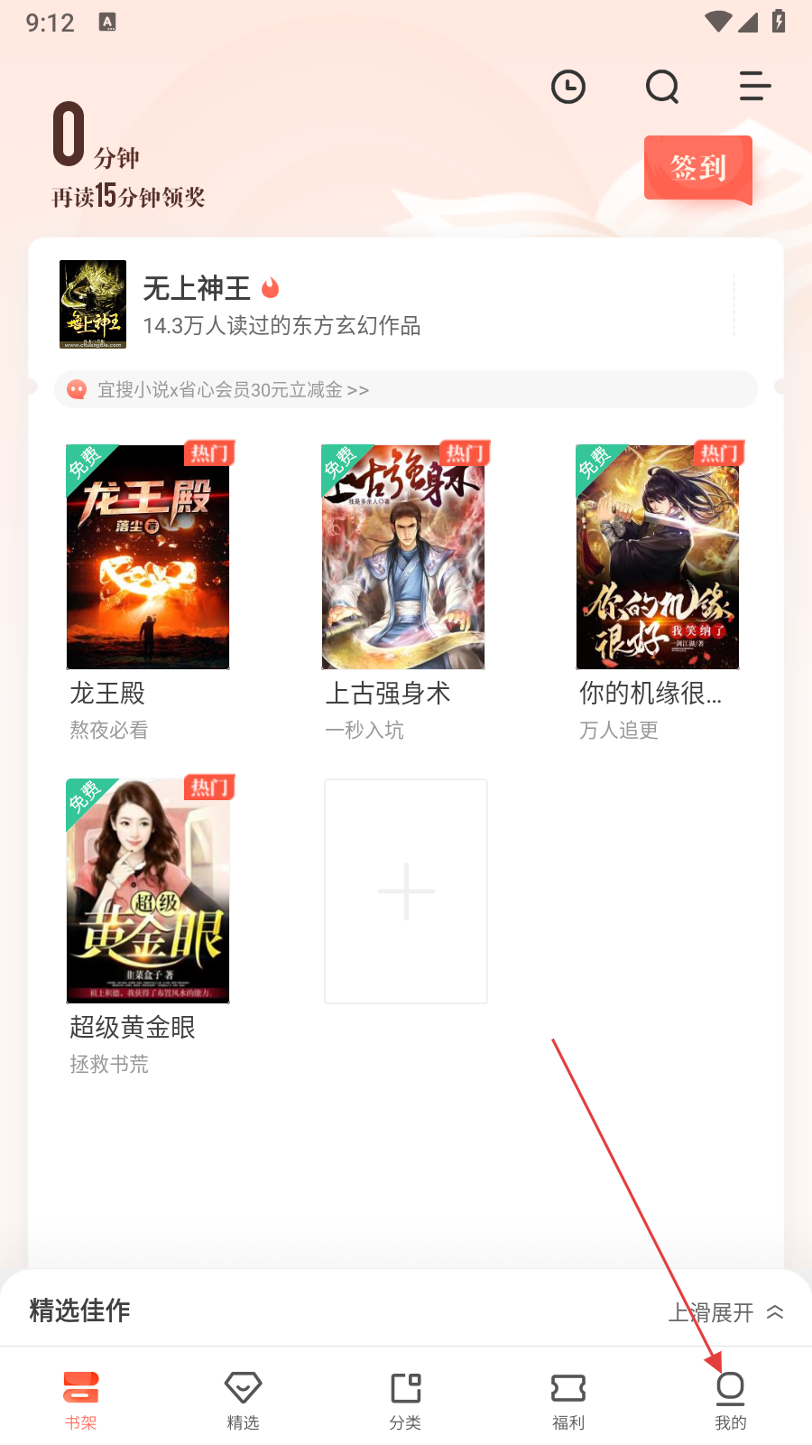 1、打開(kāi)宜搜小說(shuō)APP,點(diǎn)擊底部導(dǎo)航欄我的,進(jìn)入個(gè)人頁(yè)面。