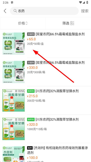 3、在搜索結(jié)果列表中,找到你需要購(gòu)買的農(nóng)藥產(chǎn)品,點(diǎn)擊進(jìn)入產(chǎn)品詳情頁(yè)面。