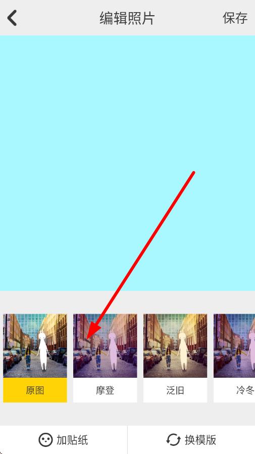 3、拍攝完成后,進入照片編輯界面,滑動下方的特效選項欄,選擇如摩登等特效 ,對照片進行美化,完成后點擊保存。