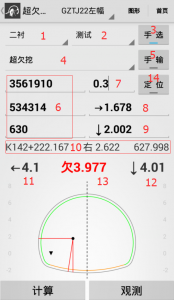 進(jìn)入隧道超欠挖界面,可以看到斷面類型、斷面、結(jié)構(gòu)點(diǎn)選擇、實(shí)測坐標(biāo)、結(jié)構(gòu)點(diǎn)指引等選項(xiàng)