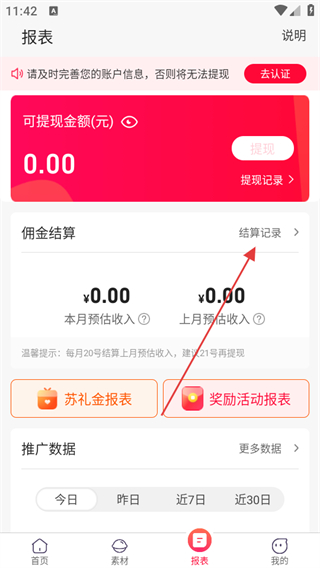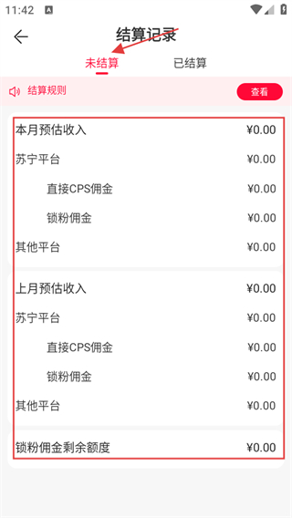 3、進(jìn)入結(jié)算記錄頁面,可查看未結(jié)算狀態(tài)下的本月預(yù)估收入、上月預(yù)估收入等相關(guān)結(jié)算數(shù)據(jù)。