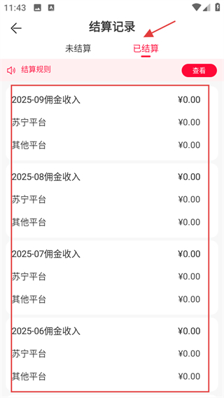 4、點(diǎn)擊已結(jié)算選項(xiàng)卡,能查看不同月份平臺(tái)及其他平臺(tái)的已結(jié)算傭金收入記錄。