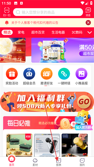 1、打開蘇寧推客APP,進(jìn)入首頁后,點(diǎn)擊底部導(dǎo)航欄中的報(bào)表選項(xiàng)。