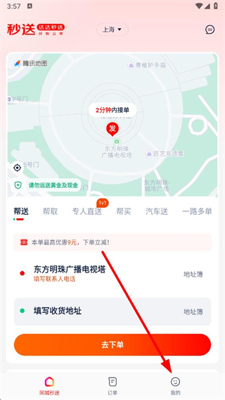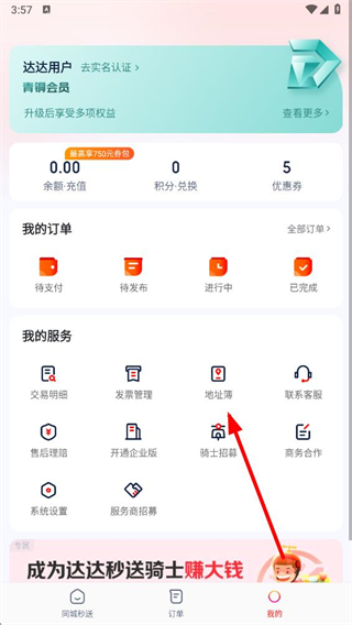1、打開達(dá)達(dá)秒送app,點(diǎn)擊右下角我的選項(xiàng),進(jìn)入個(gè)人頁面。