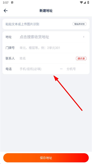 4、在新建地址頁面填寫地址、門牌號(hào)、聯(lián)系人、電話等信息后,點(diǎn)擊保存地址按鈕,即可完成地址添加。