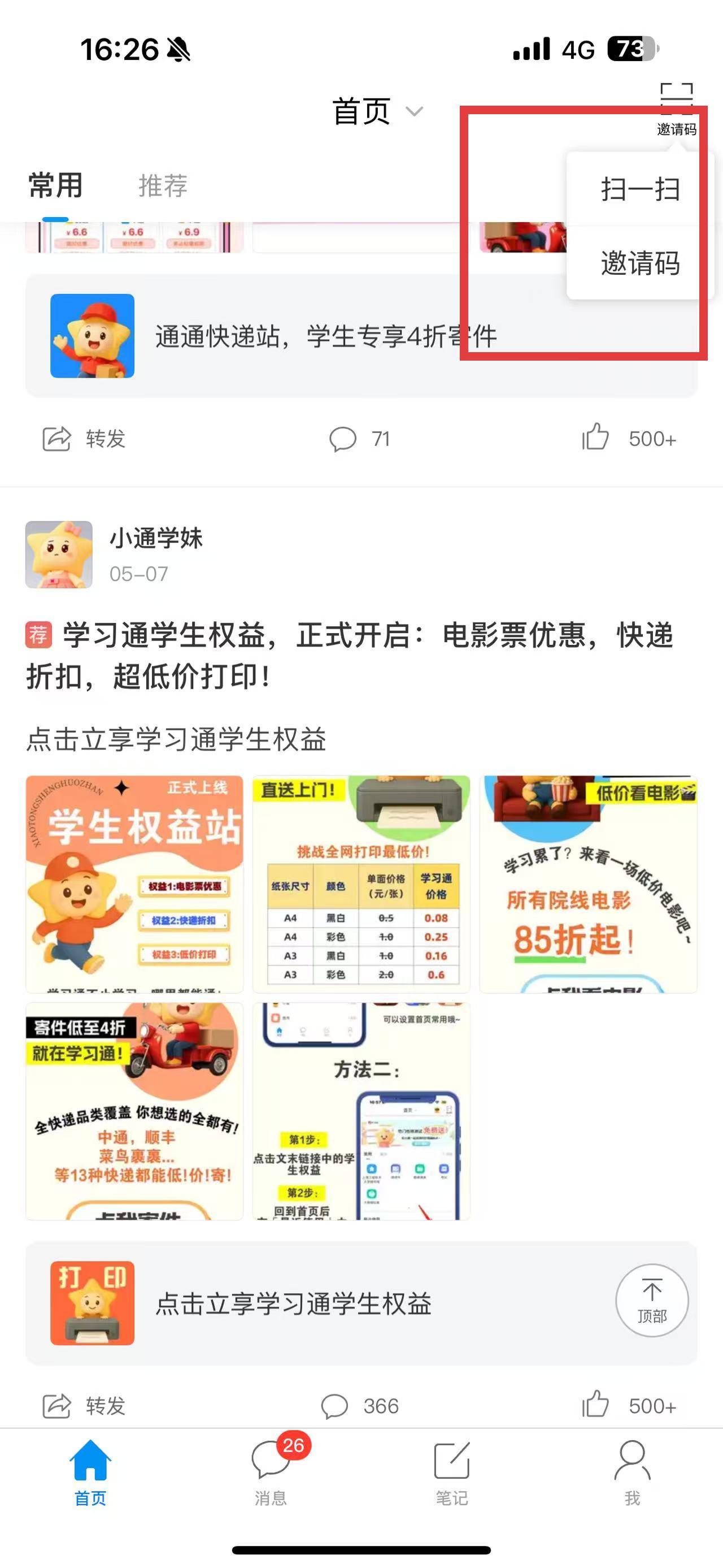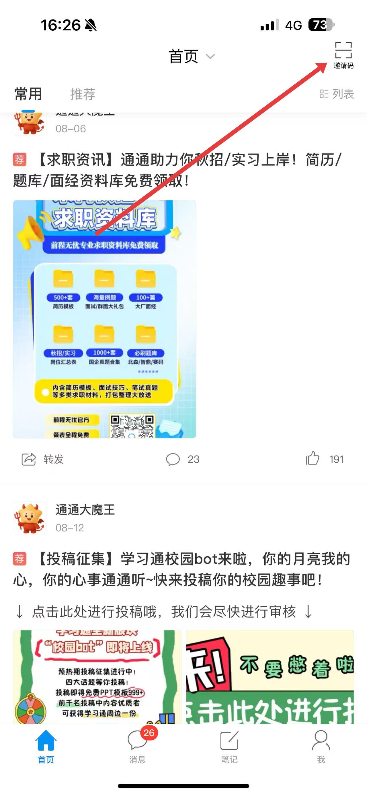 1、打開超星學(xué)習(xí)通App,在首頁界面點(diǎn)擊右上角邀請(qǐng)碼按鈕。