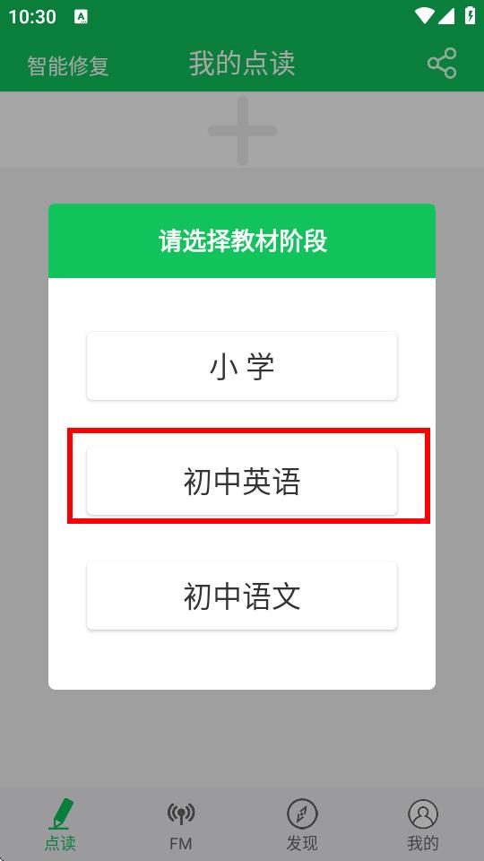 2、在彈出的請(qǐng)選擇教材階段界面中,點(diǎn)擊初中英語(yǔ)選項(xiàng)。