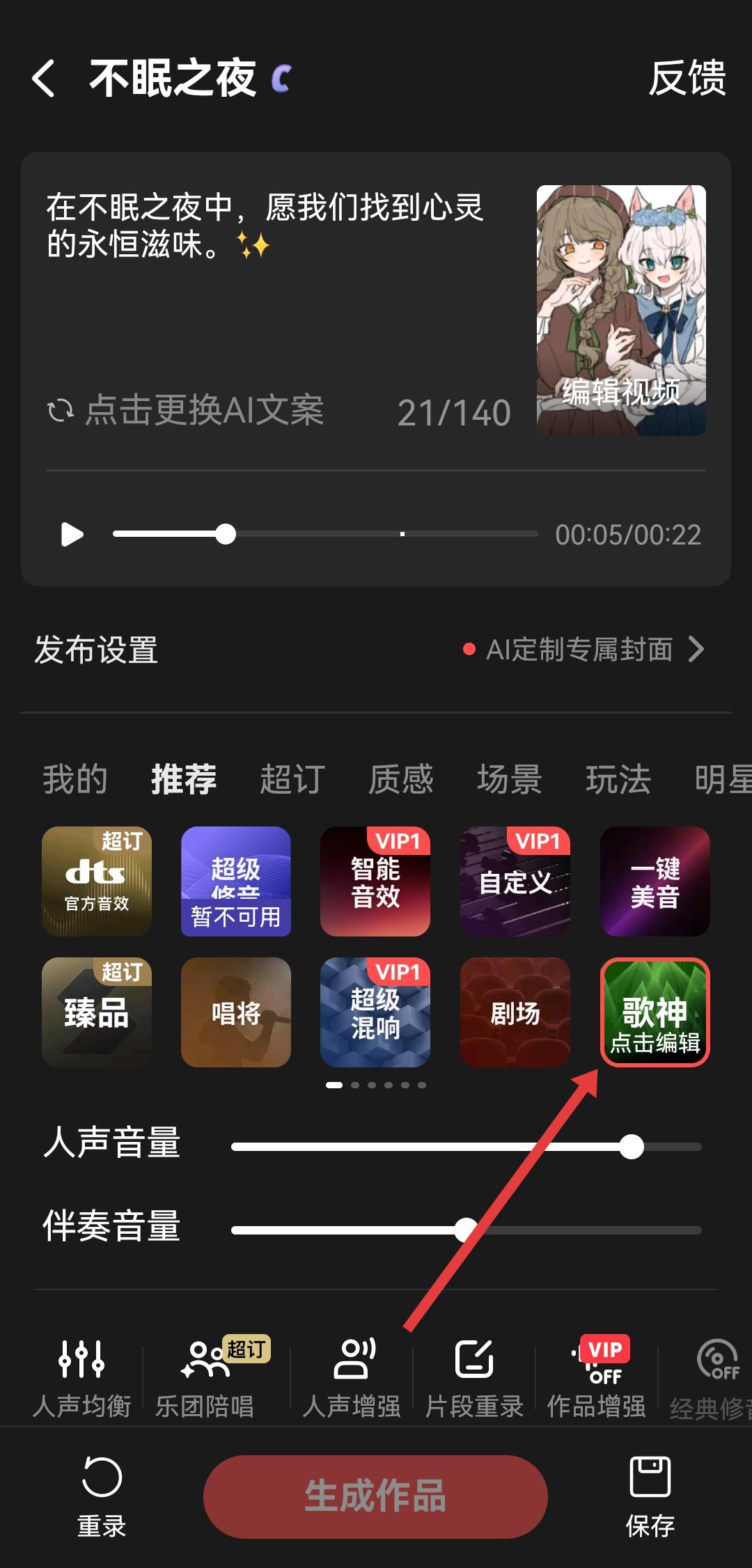 1、錄制完成進入發(fā)布設置界面后,點擊歌神的點擊編輯,選擇這一音效模板來為歌曲增添專業(yè)質感。