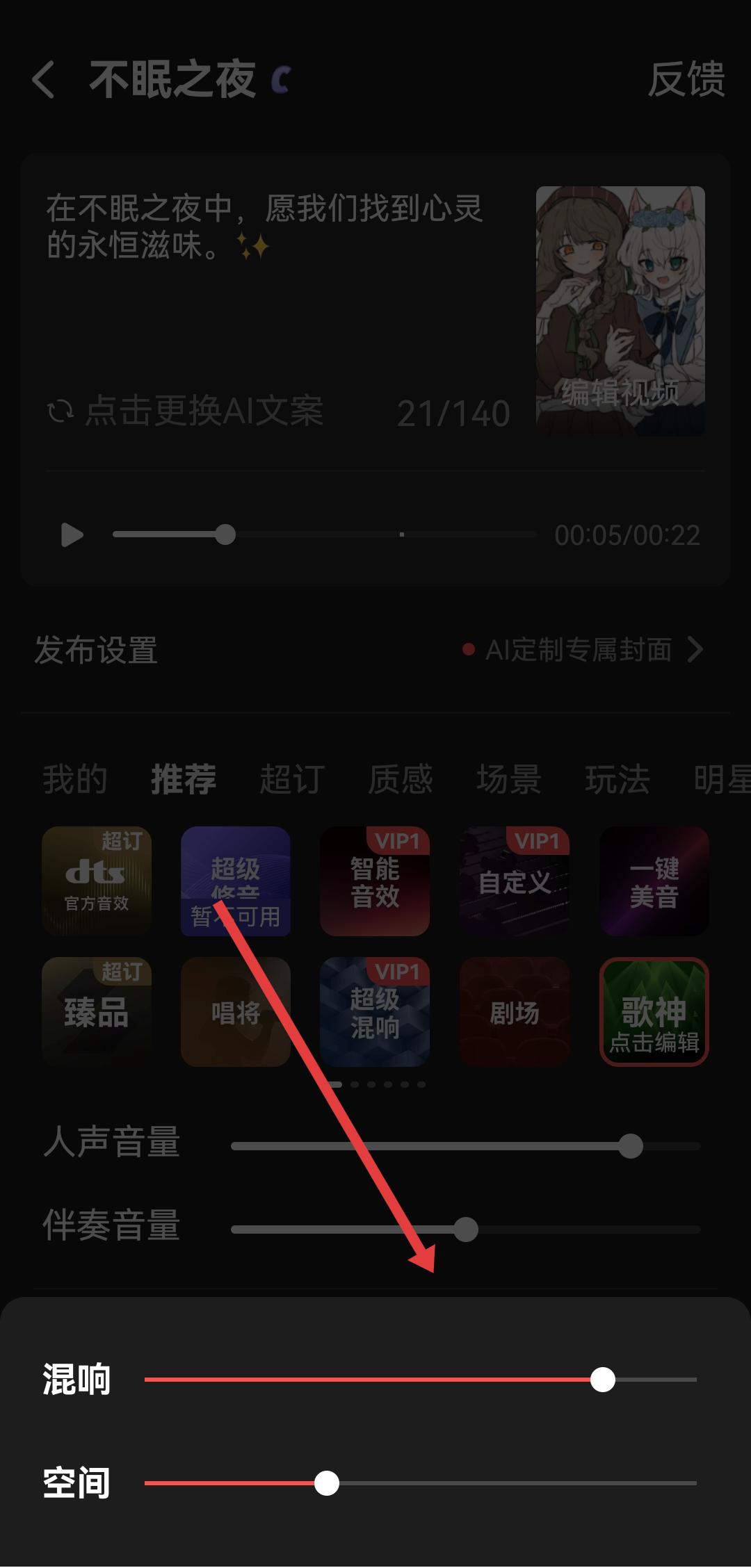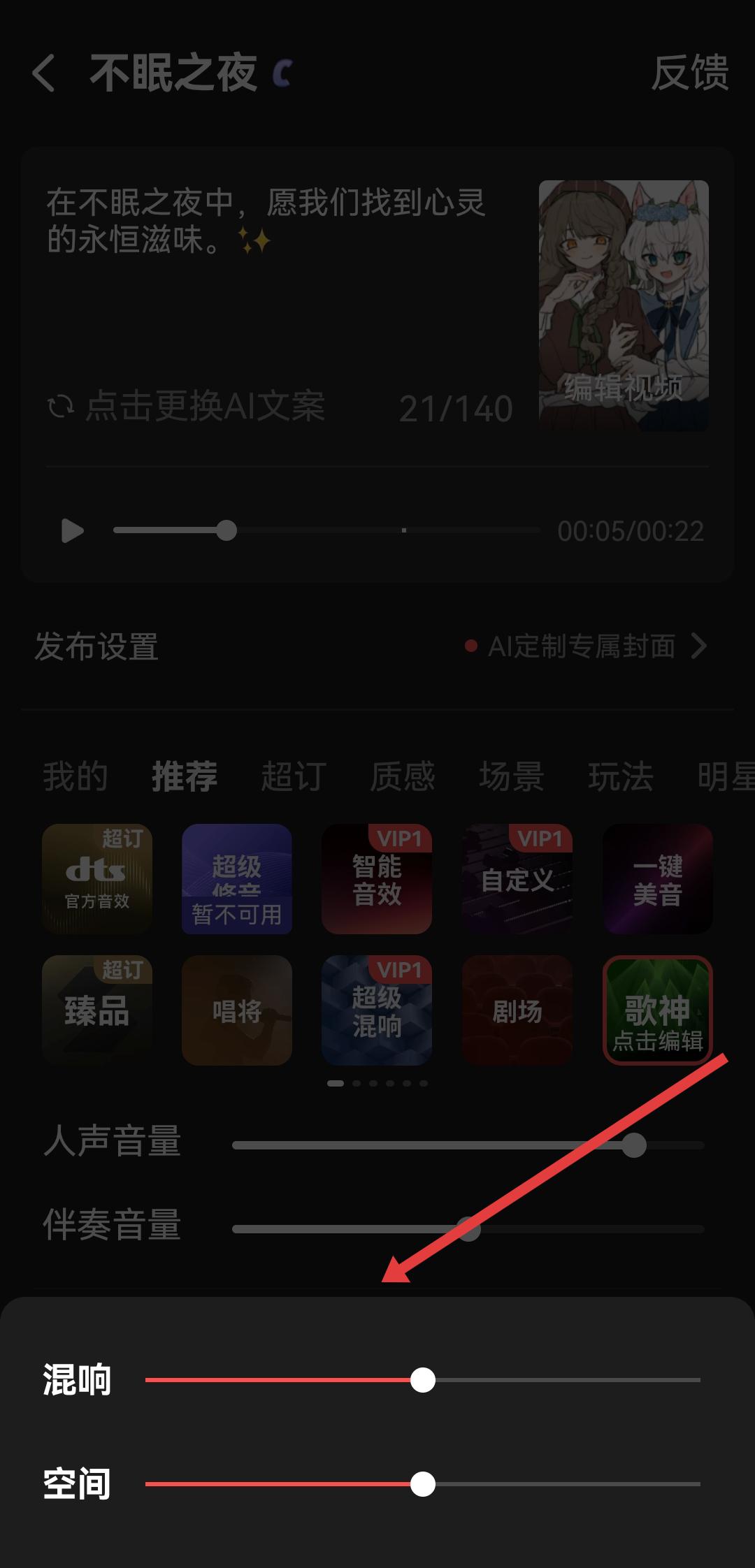 3、可以根據(jù)歌曲風格和個人演唱特點,進一步精細調節(jié)混響和空間滑塊增強氛圍感。
