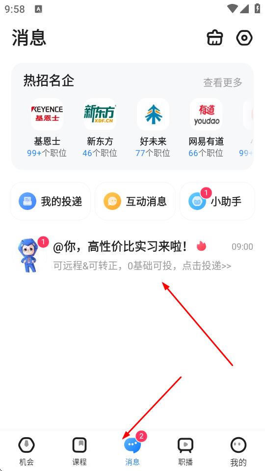 3、點擊底部消息按鈕,可查看熱招名企的崗位信息匯總,以及我的投遞反饋、互動消息等。接收官方小助手推送的求職相關提醒。