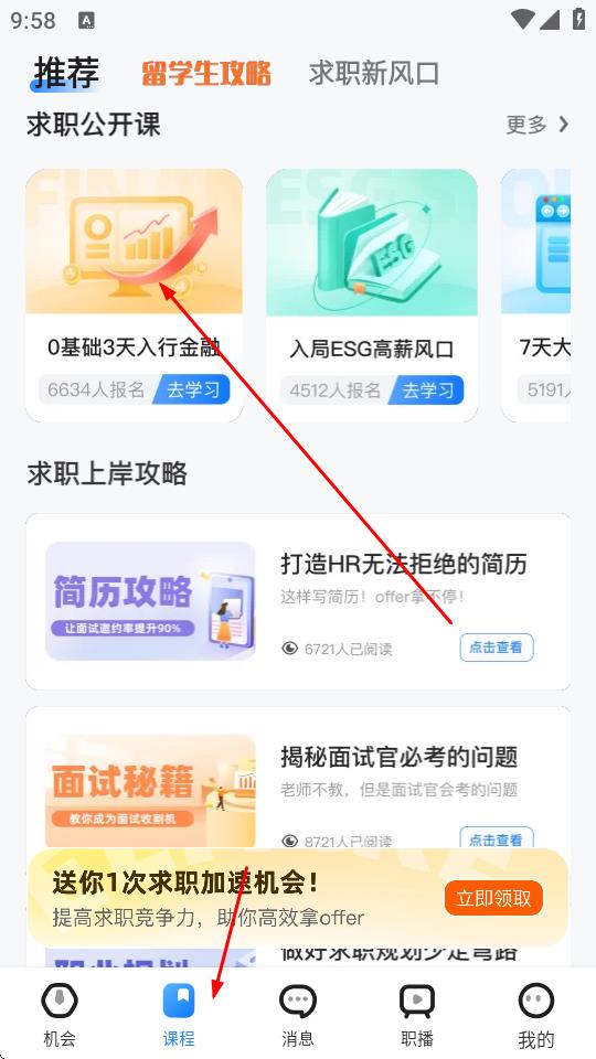 2、在課程板塊,提供各類求職公開課,還有簡歷攻略、面試秘籍等求職上岸攻略內(nèi)容,幫助求職者提升求職技能。