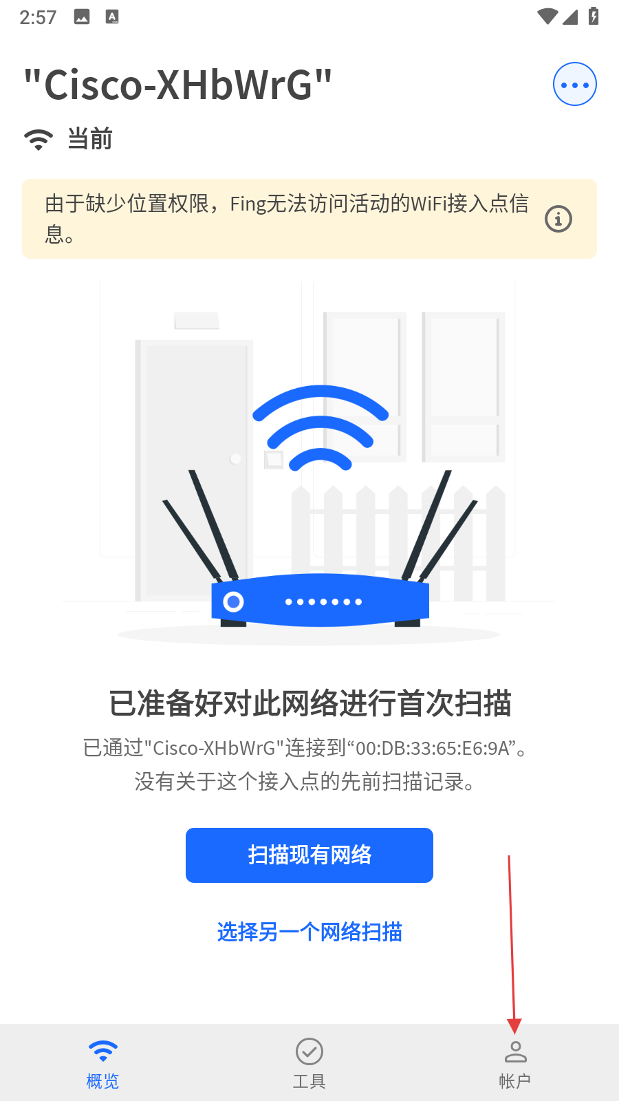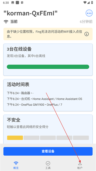 1、打開(kāi)fing網(wǎng)絡(luò)掃描儀APP,進(jìn)入主界面后點(diǎn)擊底部右側(cè)的帳戶選項(xiàng)。