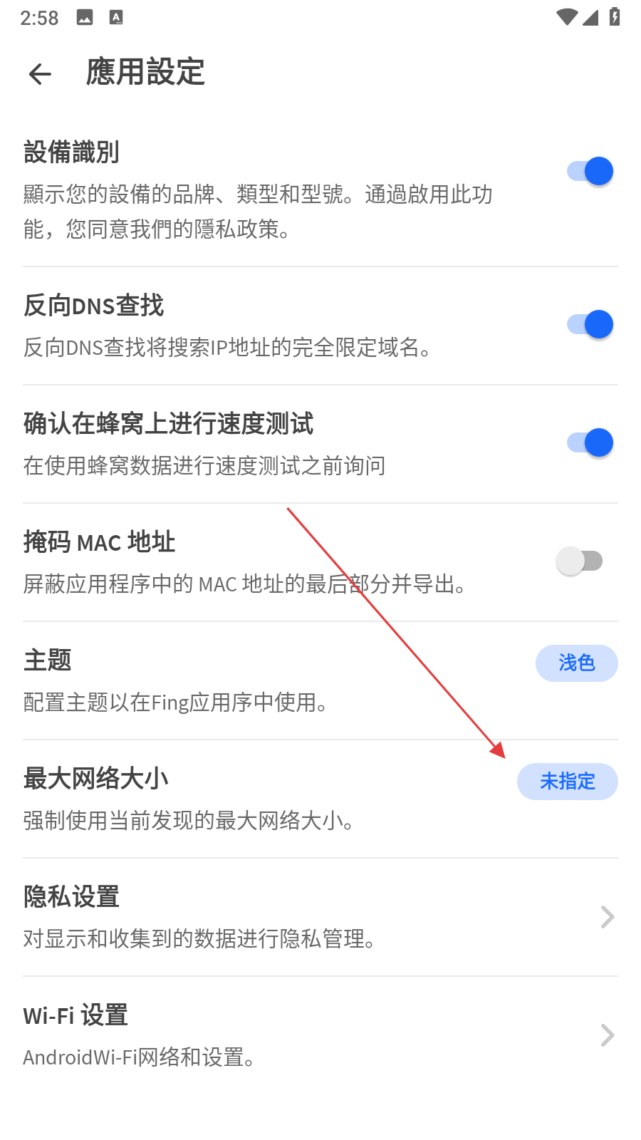 3、在應(yīng)用設(shè)置界面里,找到最大網(wǎng)絡(luò)大小選項(xiàng)。
