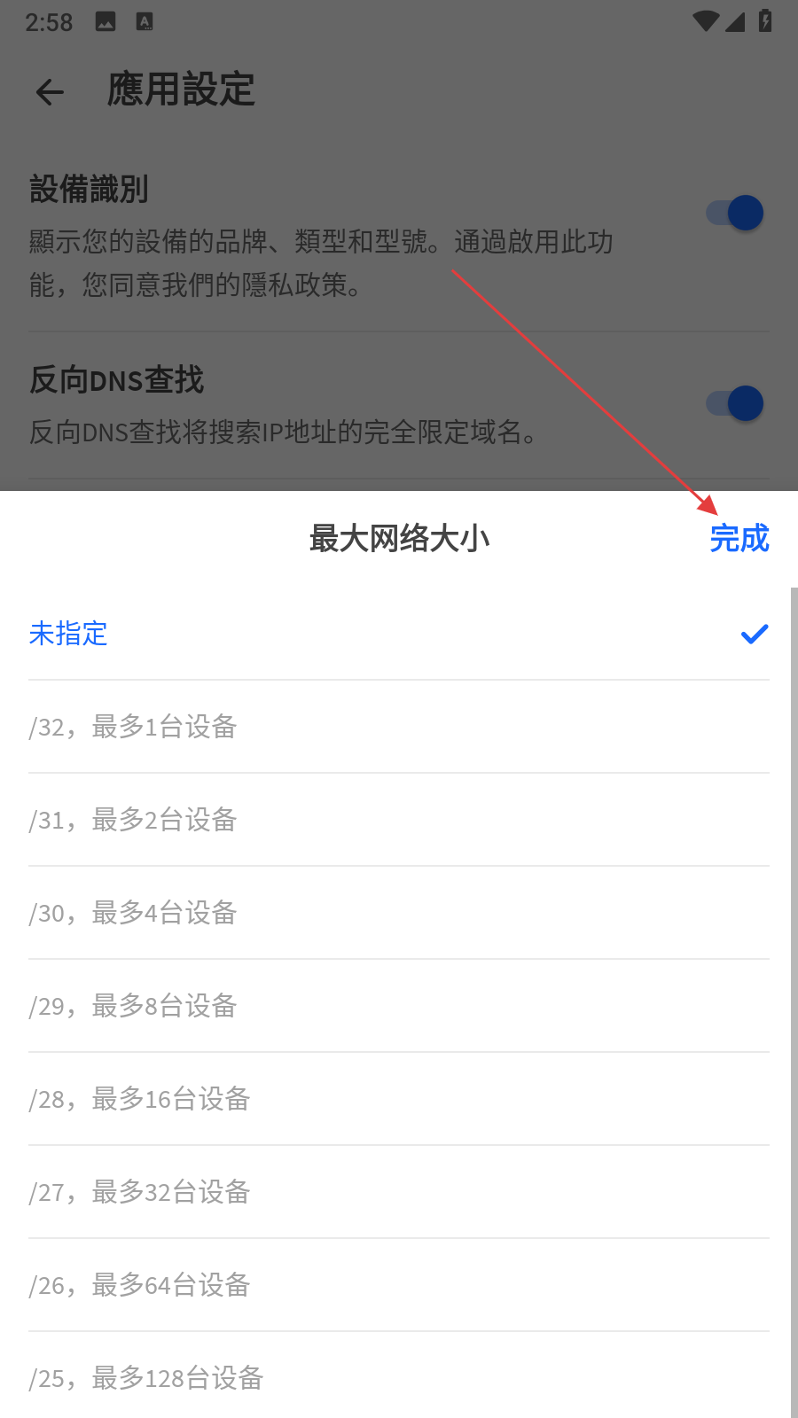 4、在彈出的列表中,根據(jù)需求選擇對(duì)應(yīng)的網(wǎng)絡(luò)大小選項(xiàng),選擇完成后點(diǎn)擊右上角完成按鈕。