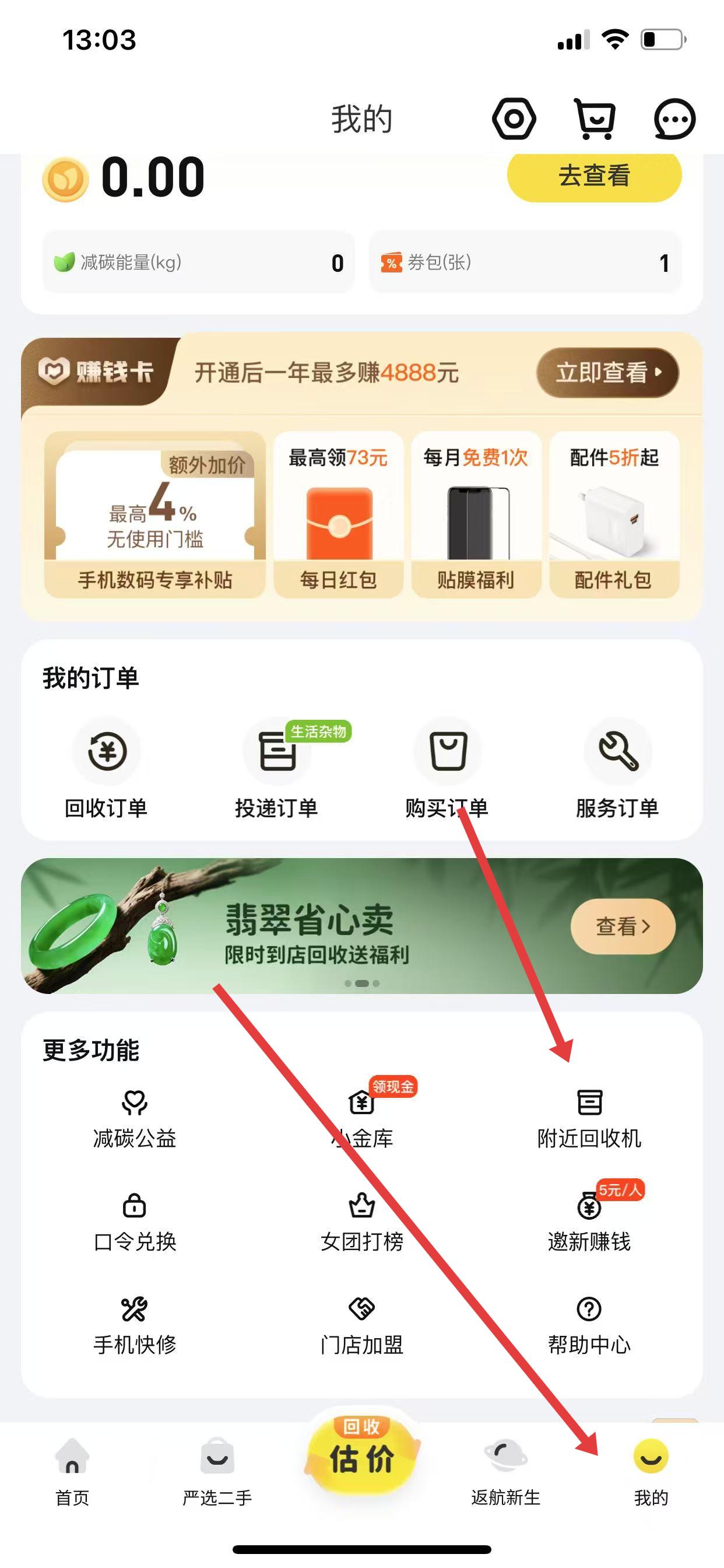 1、打開愛回收App,點(diǎn)擊下方導(dǎo)航欄中我的,在更多功能板塊,找到并點(diǎn)擊附近回收機(jī)。