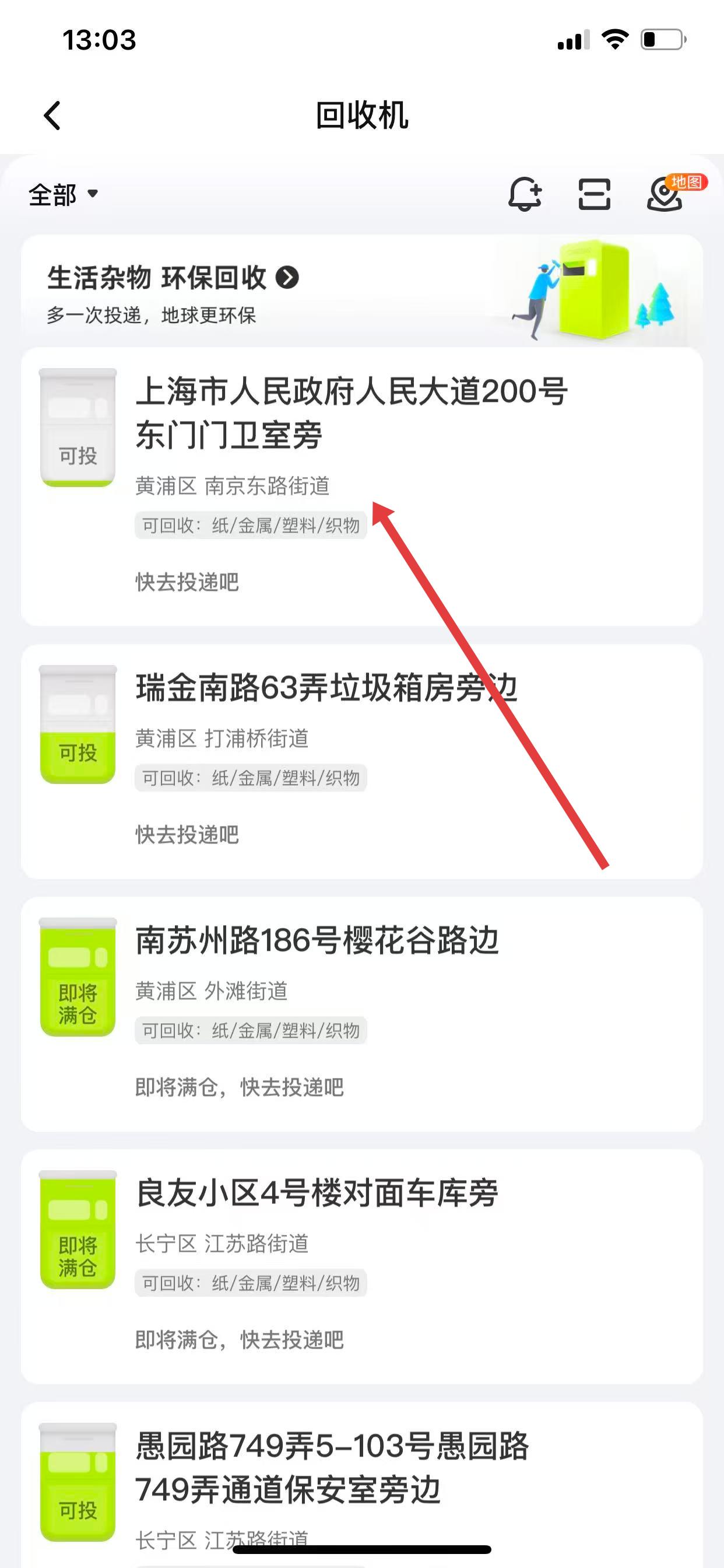 2、進(jìn)入回收機(jī)頁面后,查看各回收機(jī)的狀態(tài),若顯示可投,則代表該回收機(jī)當(dāng)前可以投遞,點(diǎn)擊想去投遞的回收機(jī)地址。