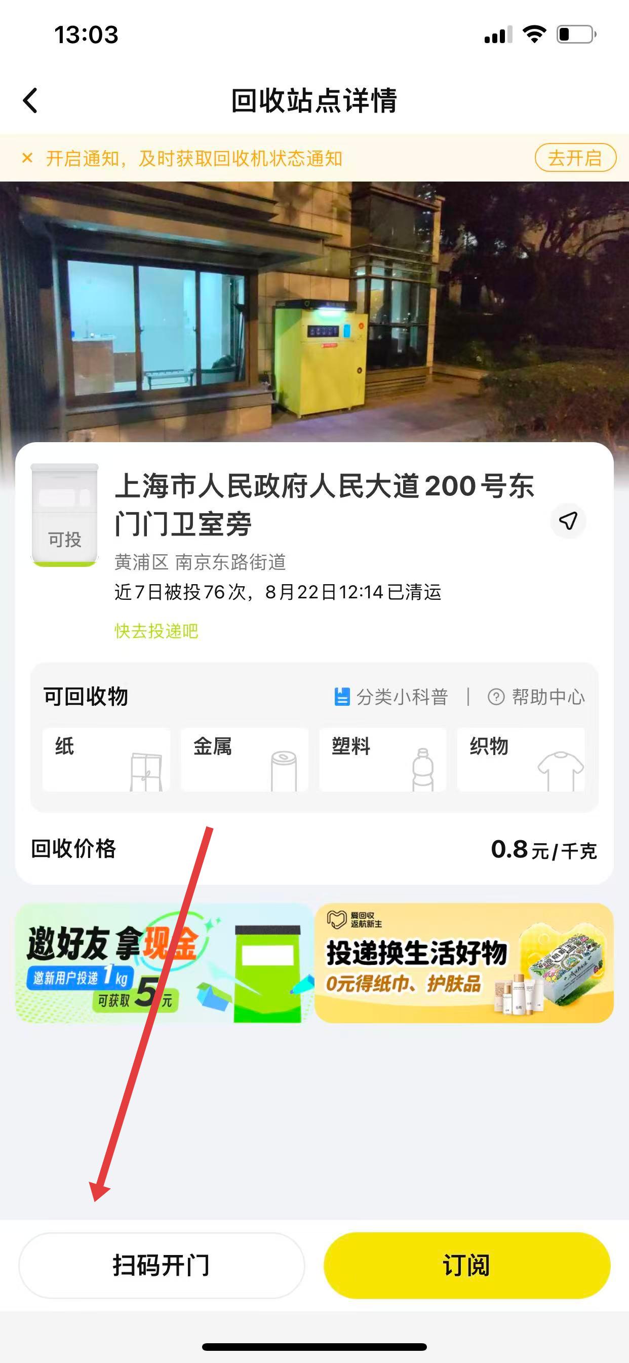 3、在回收站點(diǎn)詳情頁面,確認(rèn)回收機(jī)可回收的物品類別,點(diǎn)擊掃碼開門,即可進(jìn)行投遞 。