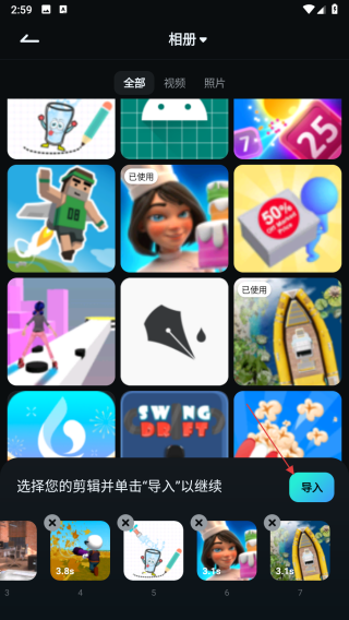 3、進(jìn)入相冊界面后,挑選需要嵌入該模板的素材,選好素材后點(diǎn)擊導(dǎo)入按鈕。