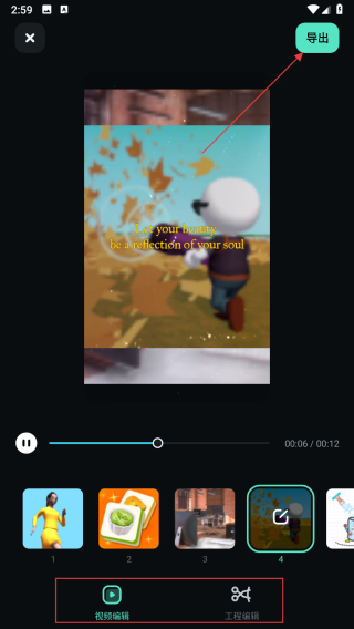 4、根據(jù)需求調(diào)整素材位置,點(diǎn)擊右邊編輯,完成后點(diǎn)擊界面右上角的導(dǎo)出按鈕,即可生成并保存使用模板制作好的視頻。