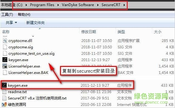 1.打開安裝包中的“8.x 注冊機”文件夾,將“keygen.exe”復(fù)制到securecrt安裝目錄(默認路徑為:C:\Program Files\VanDyke Software\SecureCRT)