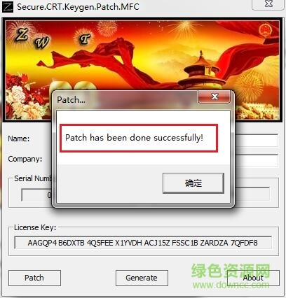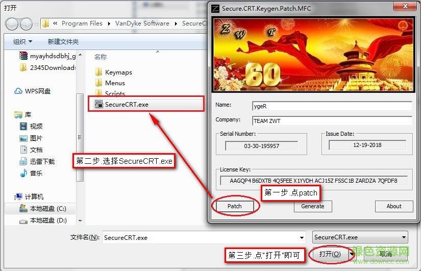 3.然后點擊“patch”,選擇“SecureCRT.exe”可執(zhí)行文件,點擊“打開”,會有“patch has been done successfully!”的提示(按下圖進行操作)