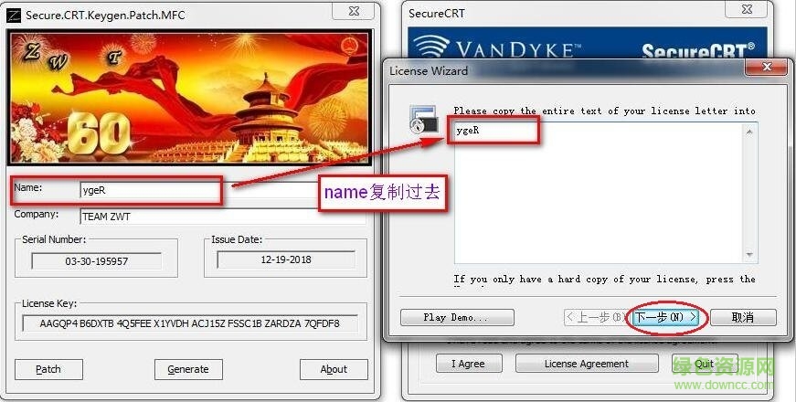 6.將注冊機中“name”信息復(fù)制到軟件界面中(如圖),然后點“下一步”