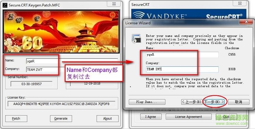 8.然后將注冊機中的Name和Company信息都復(fù)制到軟件框中(如圖),再點“下一步”