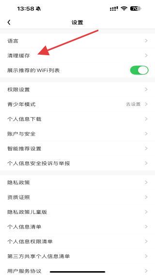 2、在設(shè)置的頁面中,找到并點(diǎn)擊清理緩存的選項(xiàng)。