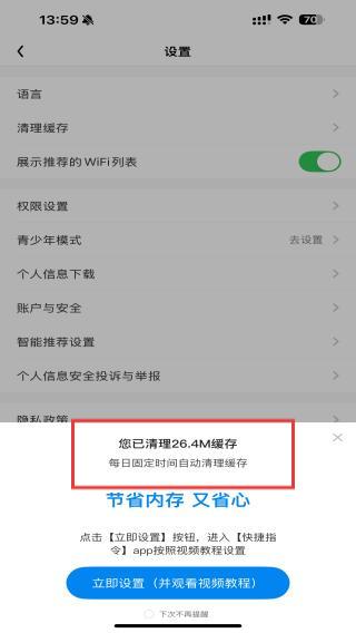 3、點(diǎn)擊后系統(tǒng)自動(dòng)清理App緩存,清理完成后會(huì)彈出您已清理緩存的提示,至此緩存清理完成。