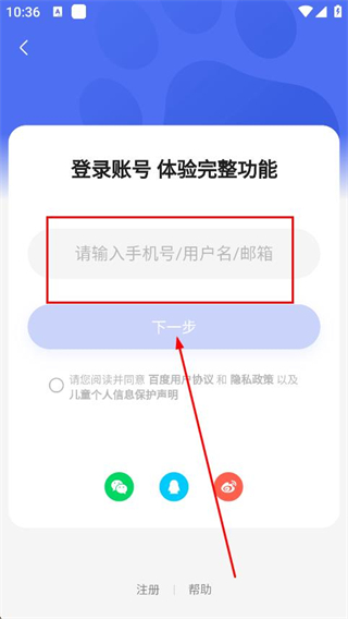 3、進(jìn)入登錄賬號頁面,填寫手機(jī)號,點(diǎn)擊下一步。