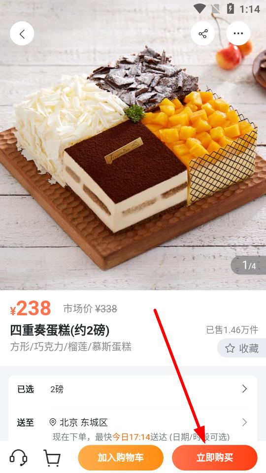 4、進(jìn)入所選蛋糕的詳情頁,確認(rèn)蛋糕規(guī)格等信息后,點(diǎn)擊立即購買或加入購物車,并按后續(xù)提示完成支付和訂單確認(rèn)操作。