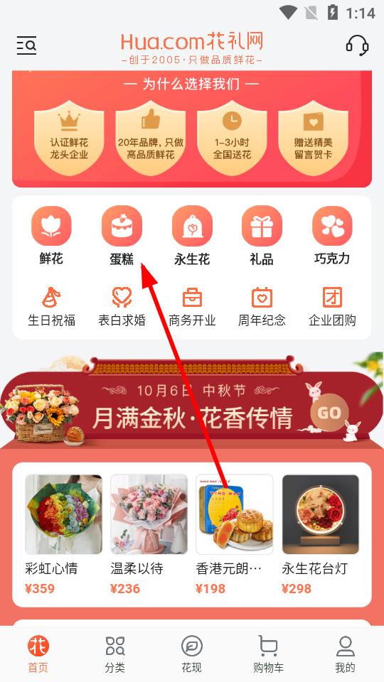 1、打開花禮網(wǎng)app,在首頁點(diǎn)擊蛋糕選項(xiàng)進(jìn)入蛋糕選購頁面。