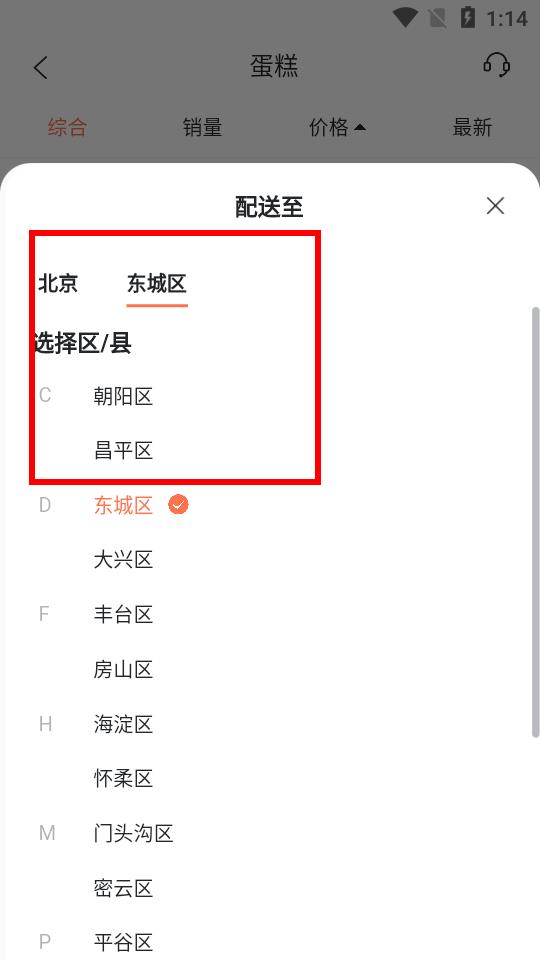 2、在蛋糕頁面上方,點(diǎn)擊配送至選項(xiàng),選擇具體的配送地區(qū),比如北京東城區(qū)。