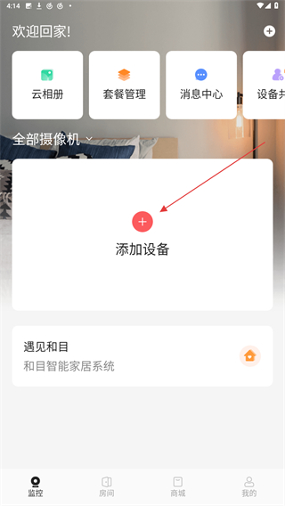 1、啟動和目攝像頭APP,進入首頁點擊添加設(shè)備的按鈕。