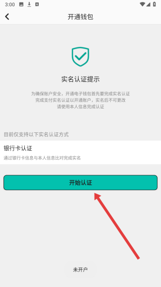 3、在開(kāi)通錢包頁(yè)面中,點(diǎn)擊開(kāi)始認(rèn)證按鈕,執(zhí)行銀行卡認(rèn)證操作。