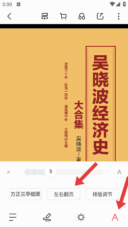 2、在書籍閱讀界面點(diǎn)擊中間區(qū)域,調(diào)出設(shè)置選項(xiàng)點(diǎn)擊右下角的A形圖標(biāo),接著再點(diǎn)擊左右翻頁的選項(xiàng)。