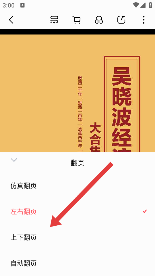 3、在翻頁方式列表里,選擇上下翻頁,設(shè)置完成后返回閱讀界面,上下滑動(dòng)屏幕即可實(shí)現(xiàn)上下翻頁閱讀。