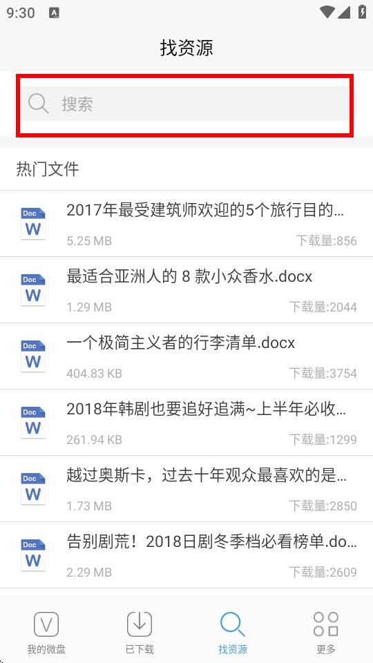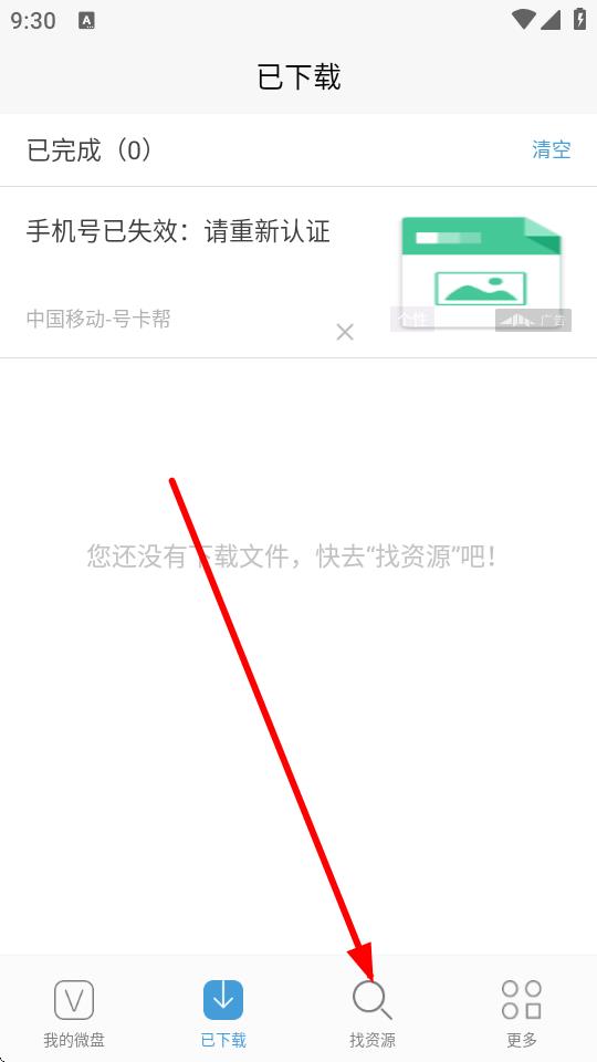 1、打開新浪微盤APP,點擊底部找資源圖標(biāo)進入找資源界面。