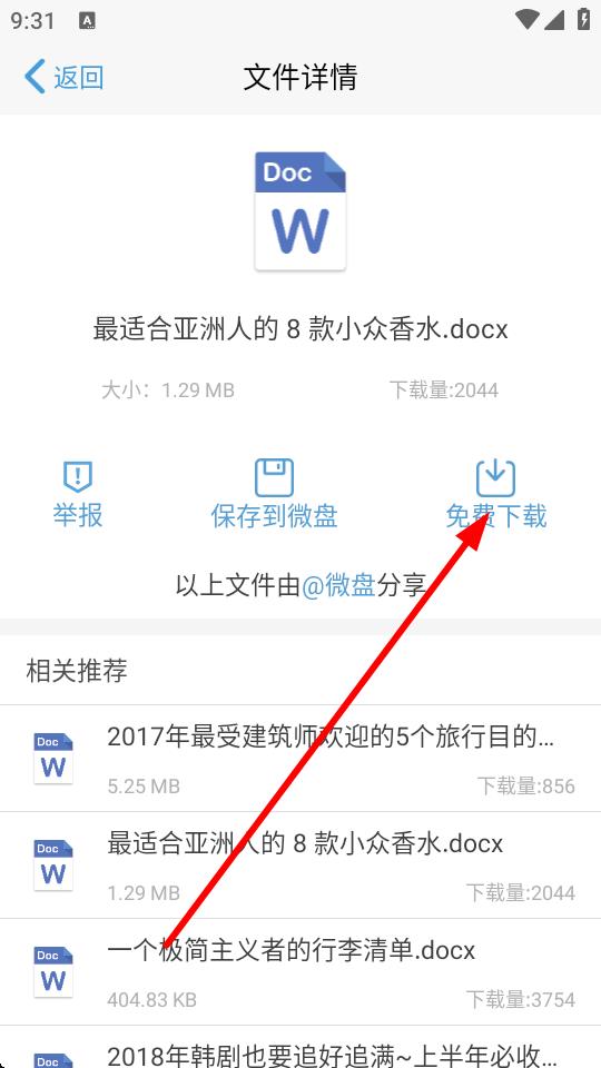 4、進入文件詳情頁面后,點擊免費下載或保存到微盤按鈕,即可獲取該資源。