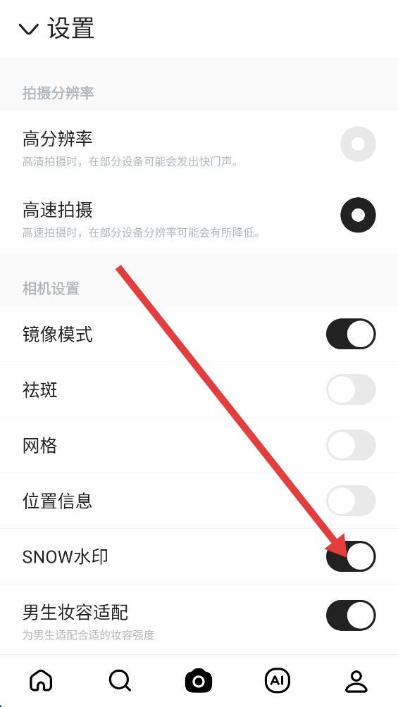 4、在設(shè)置界面中,點(diǎn)擊SNOW水印選項(xiàng)右側(cè)的開關(guān),將其關(guān)閉即可。