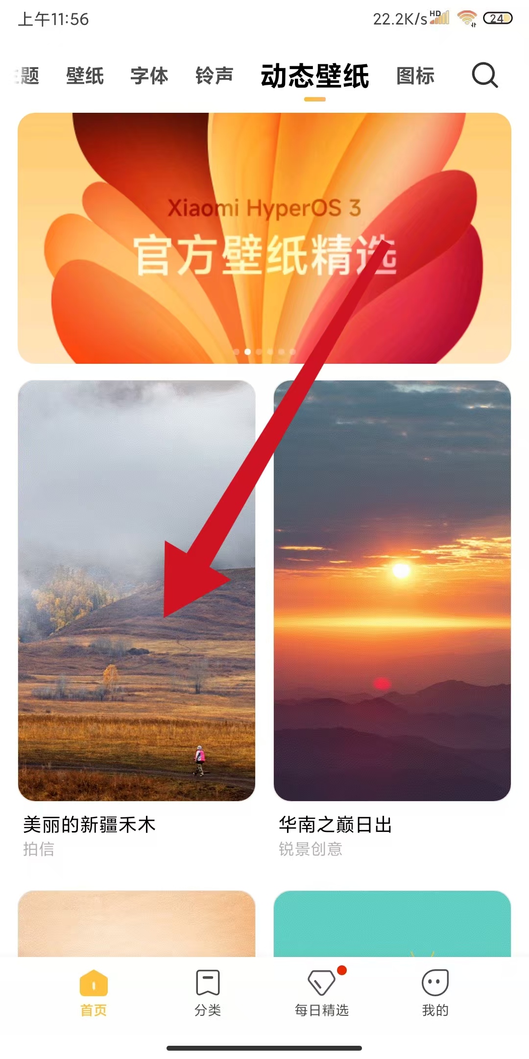 3、找到并點(diǎn)擊上方的動(dòng)態(tài)壁紙分類,瀏覽選擇喜歡的動(dòng)態(tài)壁紙。