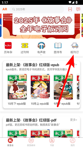 1、在故事會(huì)app首頁(yè),點(diǎn)擊紙刊訂選項(xiàng),進(jìn)入紙刊訂閱頁(yè)面。