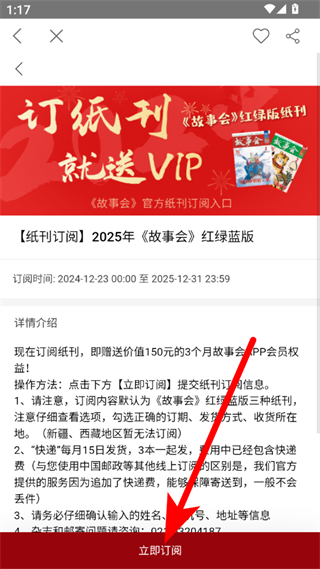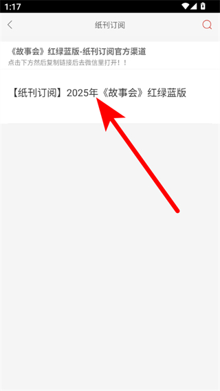 2、在紙刊訂閱頁(yè)面,點(diǎn)擊紙刊訂閱2025年故事會(huì)紅綠藍(lán)版選項(xiàng),進(jìn)入訂閱詳情界面。