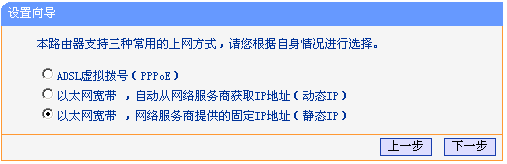 這里選第三個:以太網(wǎng)寬帶,網(wǎng)絡(luò)服務(wù)商提供的固定IP地址(靜態(tài)IP),單擊下一步: