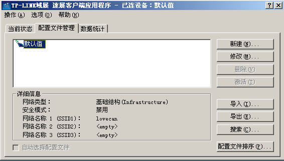 可以新建,修改,刪除和激活(有多個配置文件時)配置文件管理,導出是將配置文件導出保存,導入是將已經(jīng)存在的配置文件導入進來。搜索是尋找附近的可用的無線網(wǎng)絡(luò)。